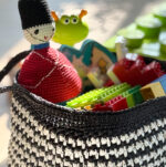 Bunden hækles rundt i fastmasker og sidestykke hækles i et nemt mønster, der sikrer en god fasthed i tasken. Hank og kant ligger dobbelt, og hankene folder ud til siden, så de ikke generer, når man skal tage ting op af kurven.